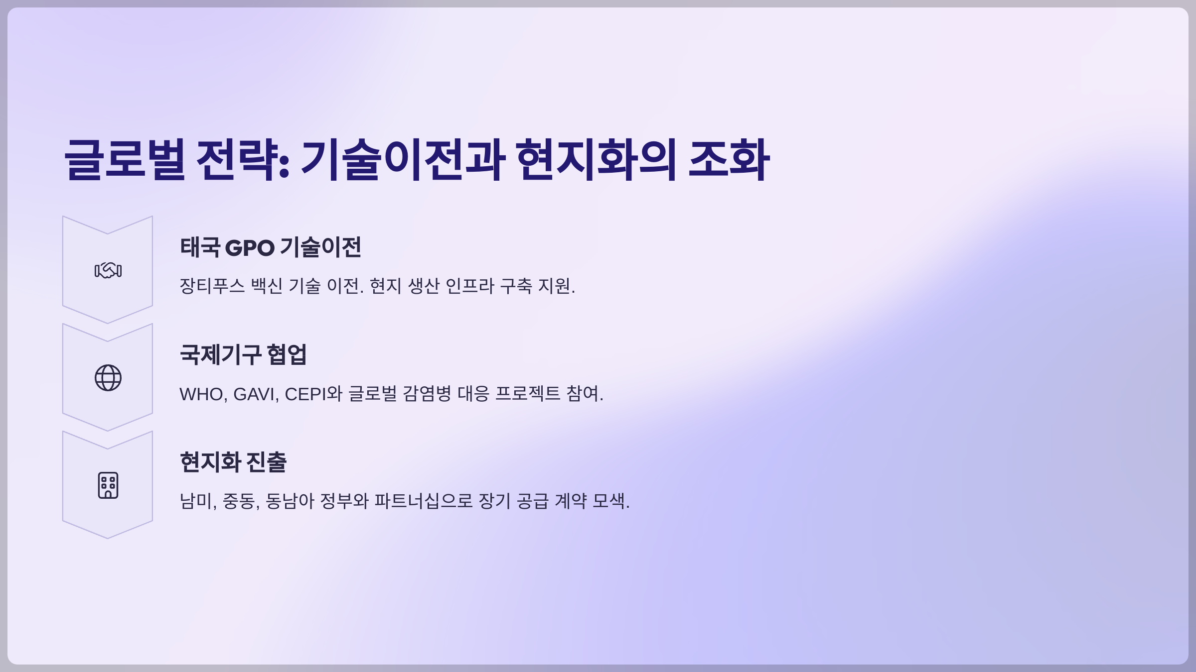 WHO, GAVI, CEPI 등과 함께 글로벌 감염병 대응 프로젝트에 참여하며, 국제 공급망 내 입지를 강화하고 있습니다. - 남미, 중동, 동남아 현지화 진출 추진