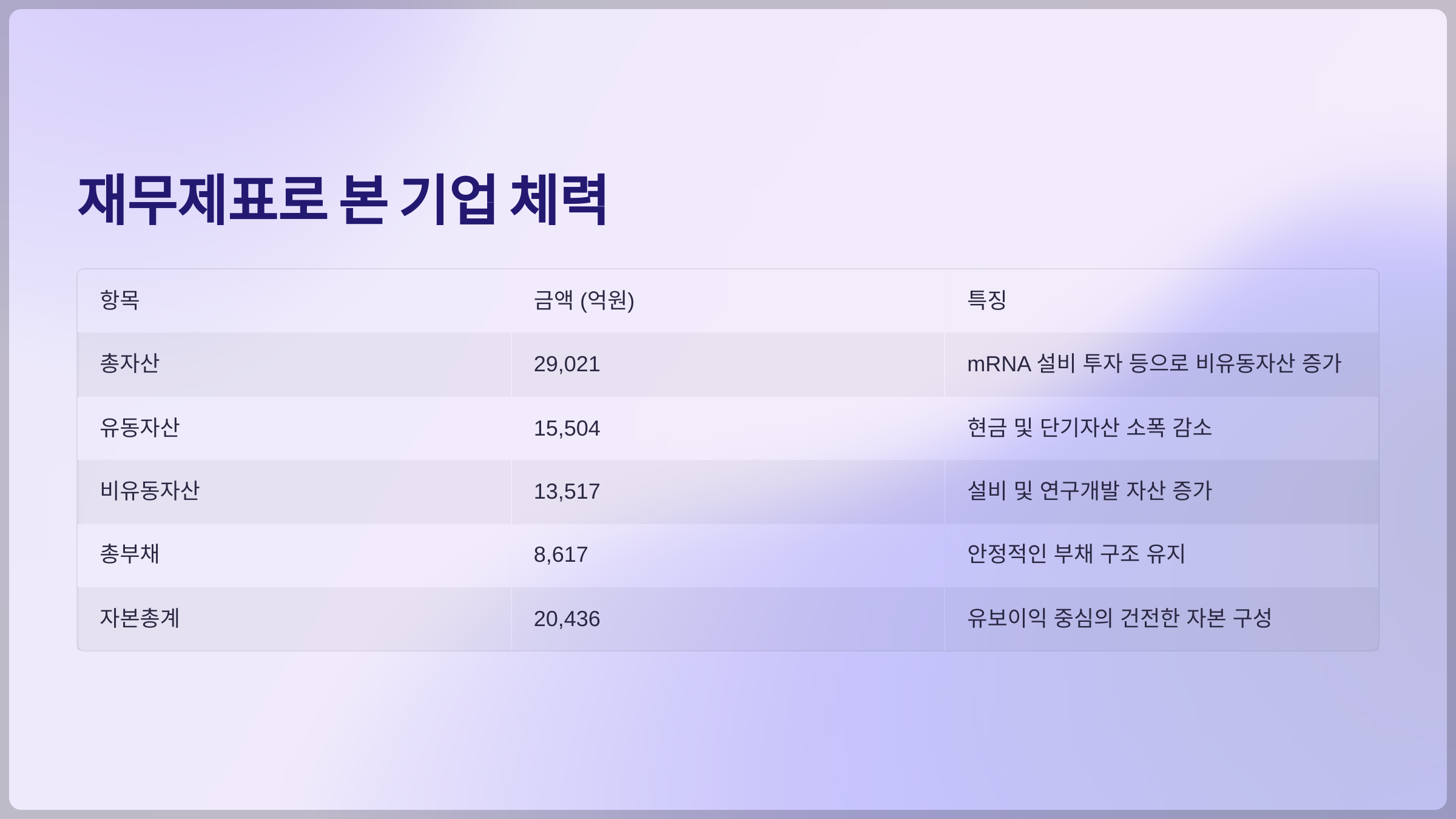 | 총자산 | 29,021 | mRNA 설비 투자 등으로 비유동자산 증가 |