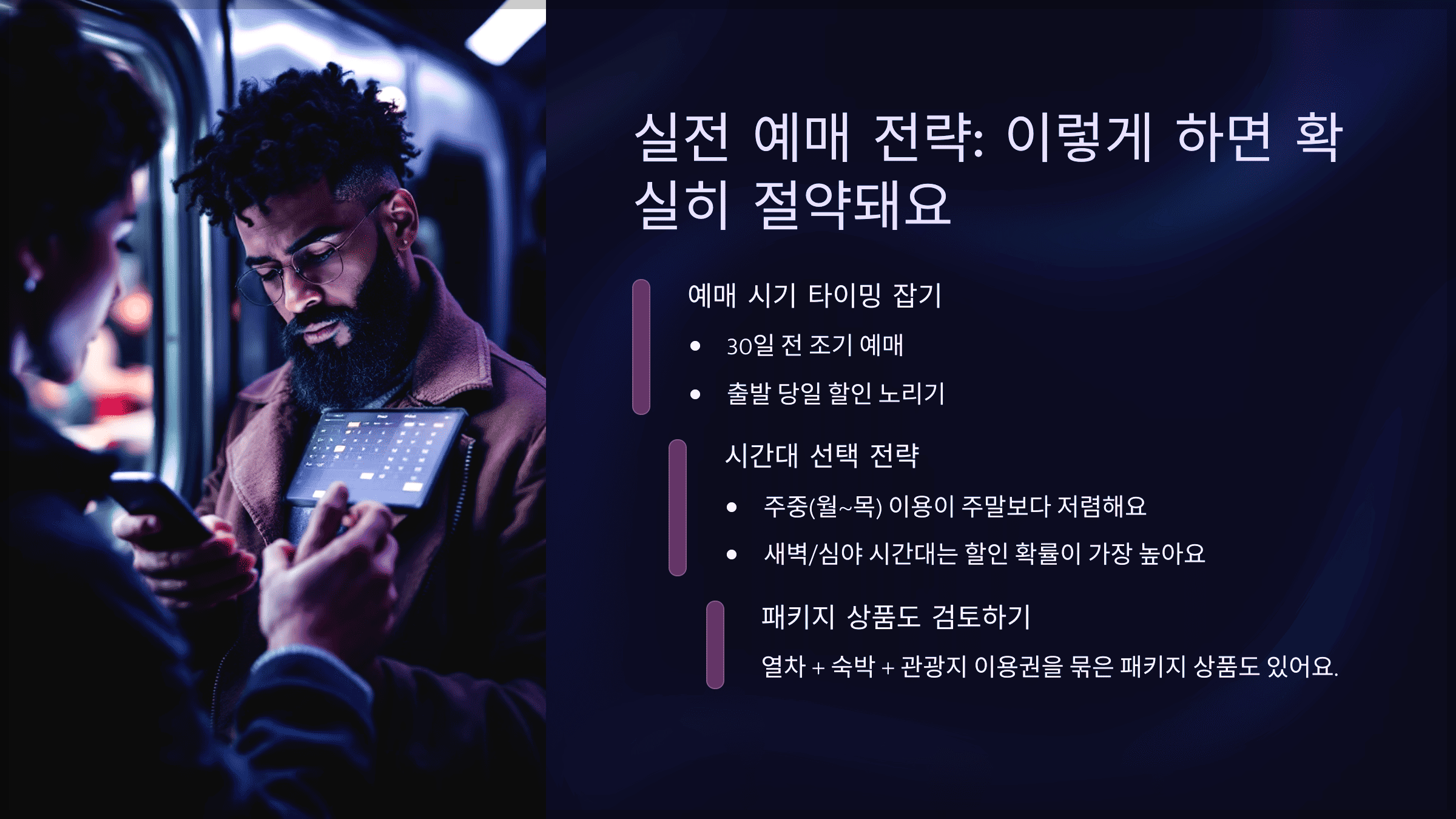 - 단거리 노선 선택: 서울-대전, 수서-오송 등은 특히 할인율이 높게 적용되는 경향이 있어요.